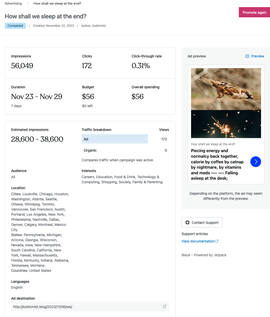 On the note of defeating fascism, WordPress ads are cheap and dead simple to set up and you are really doing the blogger and the reader both a favor because a lot of the stuff in the ad block on free-plan blogs is long junky clickbait things farming tertiary ad revenue, so whatever blog post you’re advertising, it is likely of higher value than the time sucking and money soaking tertiary clickbaiters. (negative value). WordPress ads are all moderated by humans before they run, so it IS possible to do, lookin’ at you other platforms. Organic traffic in your WordPress stats may be understated for various technical reasons. When last I checked years ago, if I had the Ghostery browser plugin turned on none of my traffic to my blog registered, even when logged out and at the library, not home. Here is a screenshot of results from my previous ad for We: