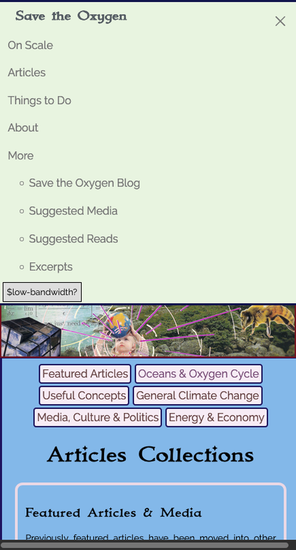 Later I pared it down to the minimum and stripped out my graphics and content and published it on GitHub as Easy Em, a one column site design (below the header) that works with great speed on any device including flip phones. The first couple days there were about 45 clones made, so I think my code must have already been in use by an educator or two somewhere. It has slowed down quite a bit since then. It also includes a robust set of Open Graph and Twitter meta tags and as far as I can tell is fully compatible with ALL of Pure CSS framework, not only the very stripped down subset I still use.