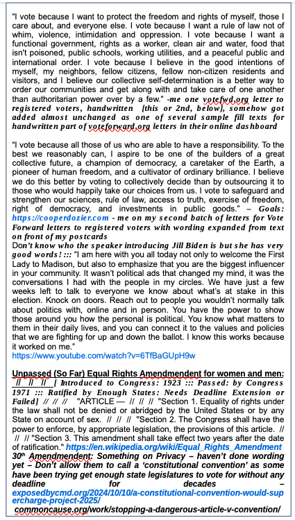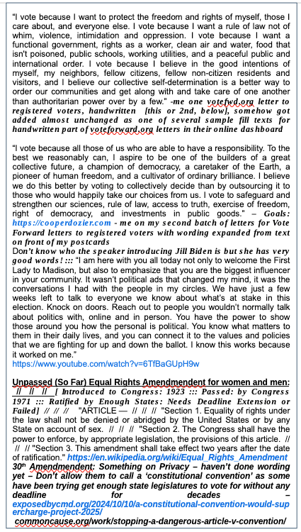 “I vote because I want to protect the freedom and rights of myself, those I care about, and everyone else. I vote because I want a rule of law not of whim, violence, intimidation and oppression. I vote because I want a functional government, rights as a worker, clean air and water, food that isn’t poisoned, public schools, working utilities, and a peaceful public and international order. I vote because I believe in the good intentions of myself, my neighbors, fellow citizens, fellow non-citizen residents and visitors, and I believe our collective self-determination is a better way to order our communities and get along with and take care of one another than authoritarian power over by a few.” -me one votefwd.org letter to registered voters, handwritten [this or 2nd, below], somehow got added almost unchanged as one of several sample fill texts for handwritten part of voteforward.org letters in their online dashboard