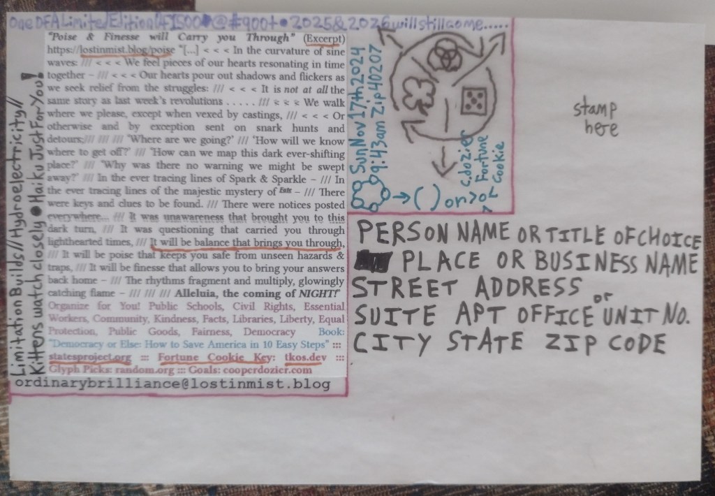 More about my 2015-Present project which was eventually named The Discordian Postcard Conspiracy: About Page of https://poeticpostcards.wordpress.com/about/ (blog eventually named “Gallery of the Discordian Postcard Conspiracy).