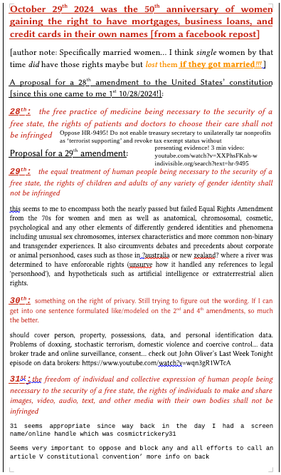 Amendment 29th: this seems to me to encompass both the nearly passed but failed Equal Rights Amendment from the 70s for women and men as well as anatomical, chromosomal, cosmetic, psychological and any other elements of differently gendered identities and phenomena including unusual sex chromosomes, intersex characteristics and more common non-binary and transgender experiences. ….. said the cishet white male he/him. I certainly wouldnt object if anyone ever referred to me as a they for any reason though… but I am also not a constitutional scholar or any variety of lawyer. neither were most of the framers….