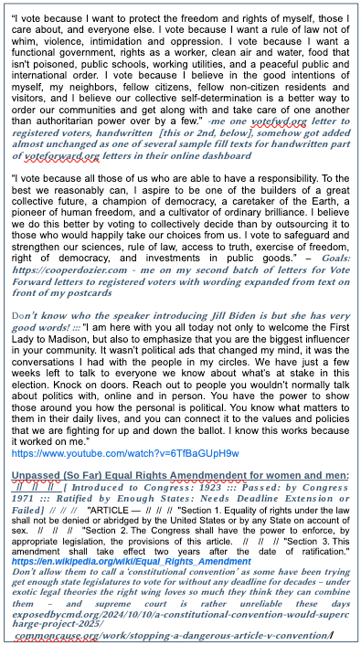 “I vote because I want to protect the freedom and rights of myself, those I care about, and everyone else. I vote because I want a rule of law not of whim, violence, intimidation and oppression. I vote because I want a functional government, rights as a worker, clean air and water, food that isn’t poisoned, public schools, working utilities, and a peaceful public and international order. I vote because I believe in the good intentions of myself, my neighbors, fellow citizens, fellow non-citizen residents and visitors, and I believe our collective self-determination is a better way to order our communities and get along with and take care of one another than authoritarian power over by a few.” -me one votefwd.org letter to registered voters, handwritten [this or 2nd, below], somehow got added almost unchanged as one of several sample fill texts for handwritten part of voteforward.org letters in their online dashboard