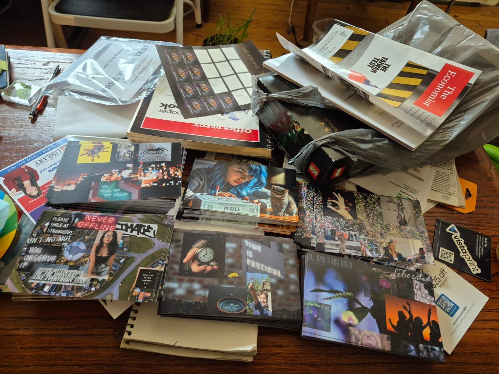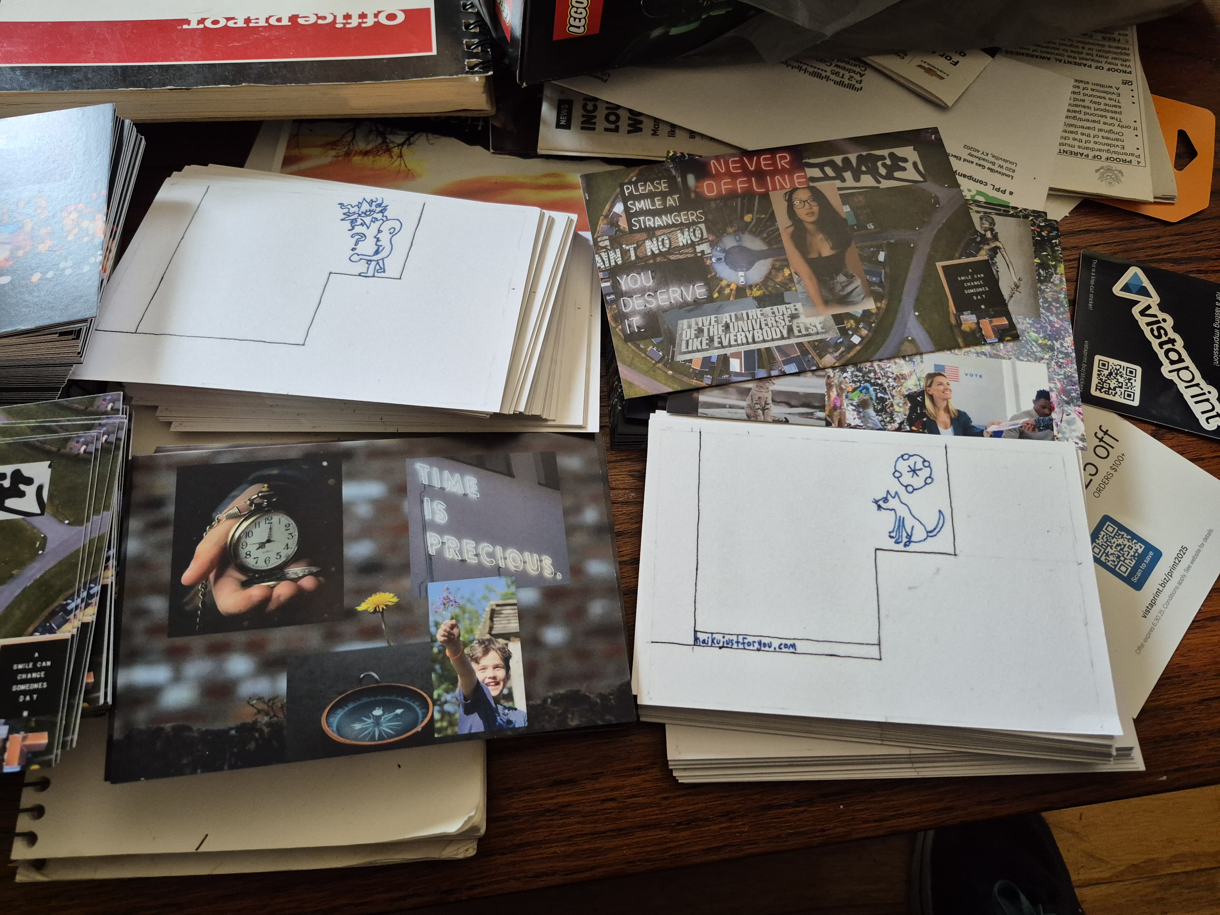 the one with the puzzle girl and unreally tiny AI kitten is unmarked so they wont have the slightest idea why they got a postcard except a stamp on the stamp saying louisville ky