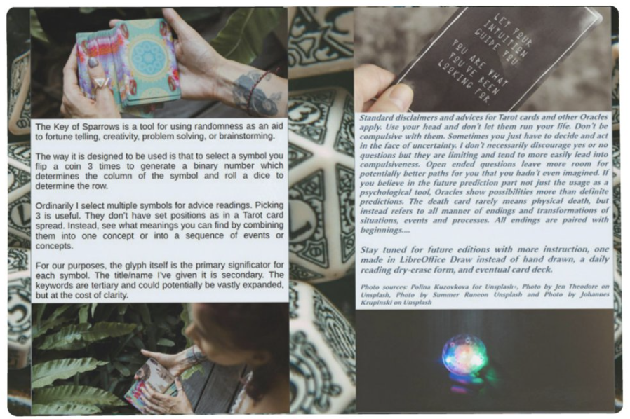 Got my first The Key of Sparrows product online, available for purchase. 12×18″ laminated print with brief instructions on the back.