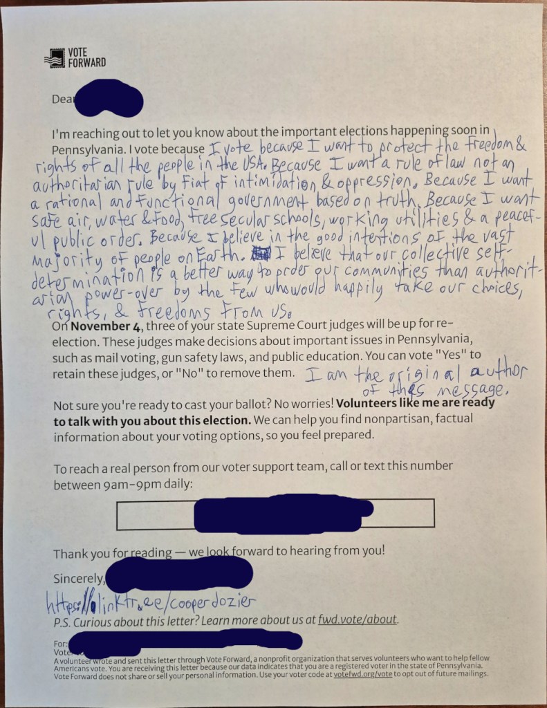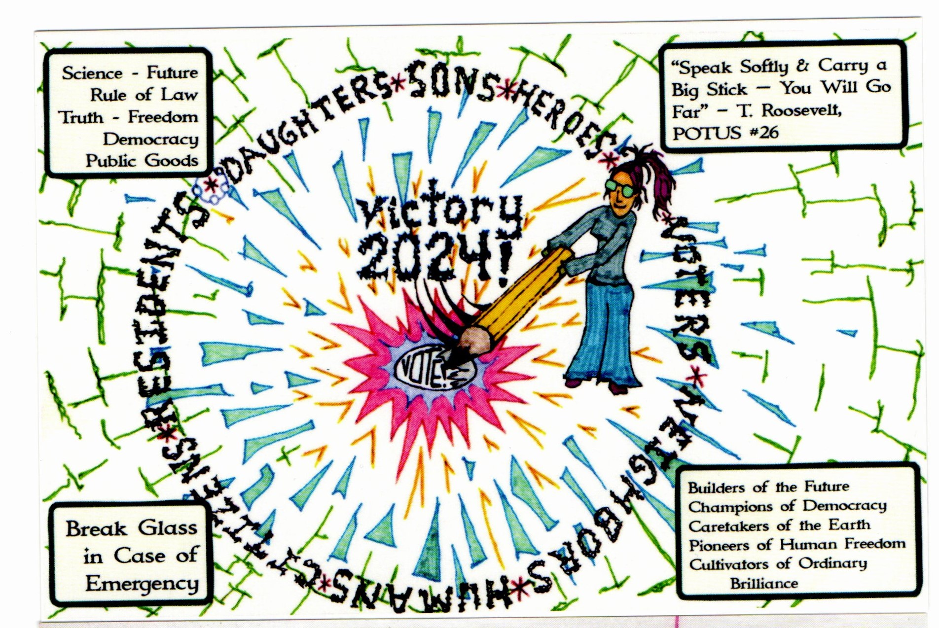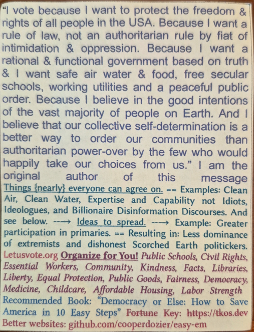 Vote Forward (https://votefwd.org) connects volunteers to voters to increase voter turnout without resorting to partisanship. I have updated my statement that I’ve used on Vote Forward letters and also in my own postcard campaigns. It’s included below. I still have some of the Victory 2024 postcards left and I have been printing out and gluesticking a sticker over ‘victory 2024’ to say ‘United We Fight It’, but I think I’ll be changing it to ‘Free & Fair Elections 2025’ for the remainder of the pile.